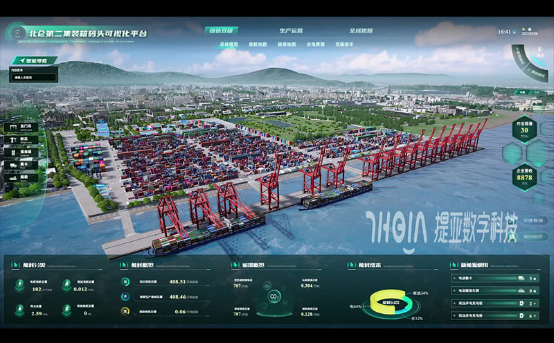 以“碳中和能源管控”为切口,围绕“数字码头”建设愿景,建设数据生产运营、碳中和能源管控、全景智能监控等三维可视化展示的码头全域生产安全能源管控平台,实现港区运营管控精准化。